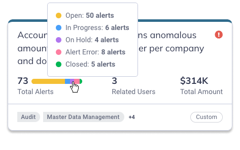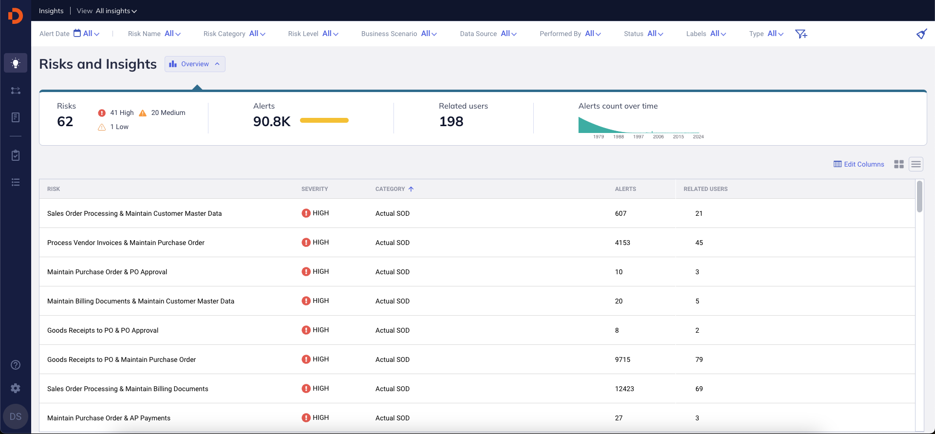 On this screen, you'll find valuable insights into the various risks within your system. Each risk is accompanied by a count of alerts and a total financial exposure, providing a clear overview of potential issues.